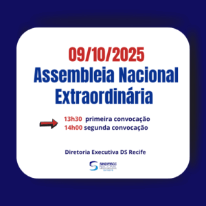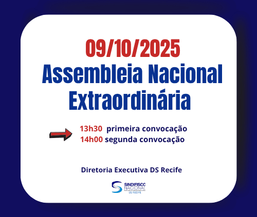 A Diretoria Executiva do Sindifisco Nacional convocou Assembleia para o dia 9 de outubro, quinta-feira (edital da DS Recife anexo). Neste mesmo dia teremos a Assembleia-Geral pré-CDS (assembleia local). Confira os horários: